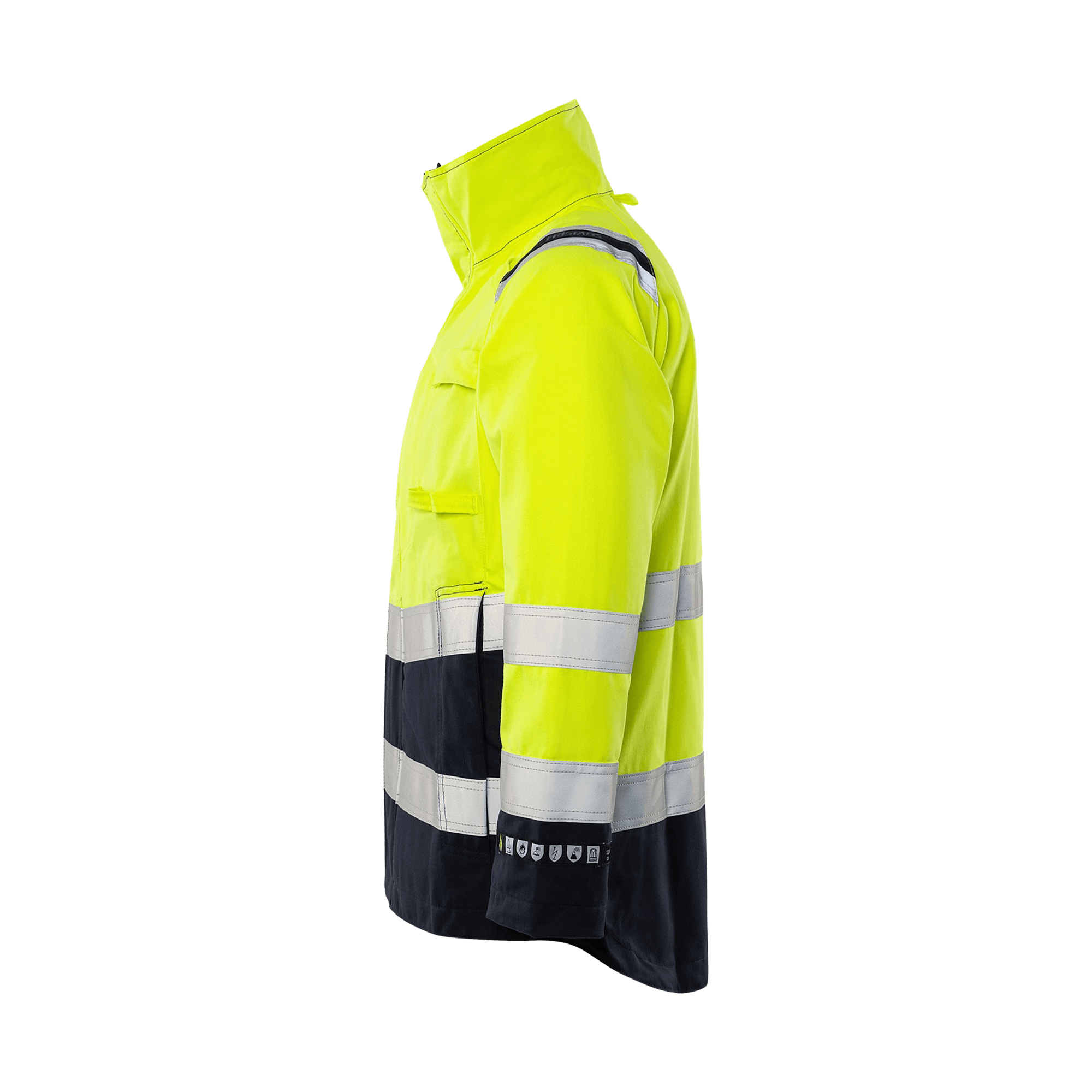 High-visibility certified jacket with inherent flame protection, specially adapted for ATEX environments with no metal details. The jacket is approved for industrial laundry and designed for durability and soft comfort. It provides certified multinorm inherent protection and features a fabric that is resistant to dirt, oil, and water, ensuring long-lasting performance in demanding conditions. Please note: This is an On Demand item, which means it is printed specifically upon order. As a result, the delivery time will be approximately two weeks longer than usual. Also, no returns due to the same reason.