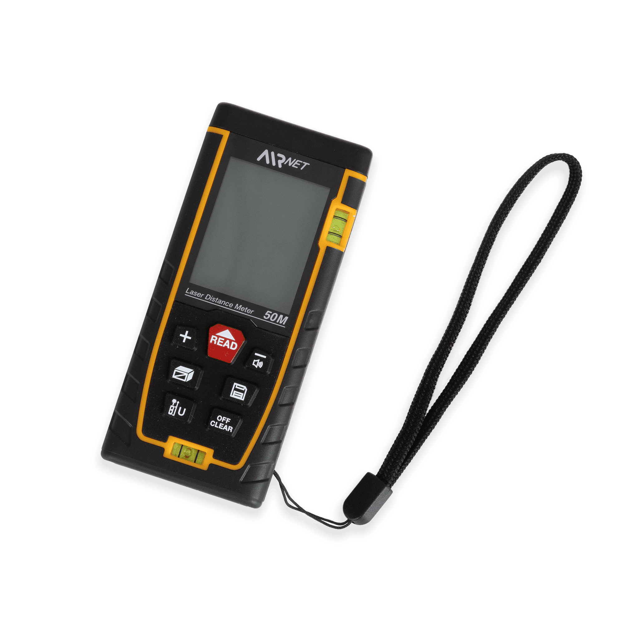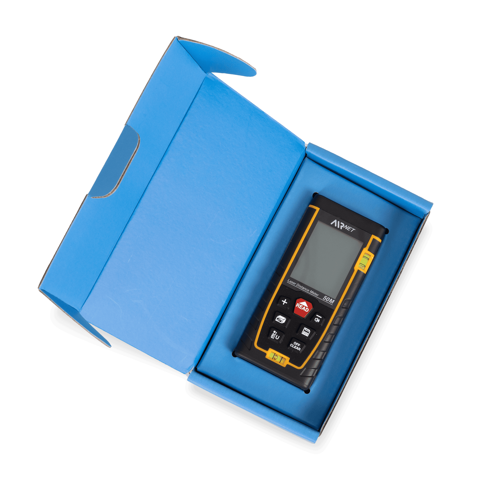 This compact and durable laser distance meter delivers accurate and stable measurements with low distortion, thanks to its aspheric optical lens and dual photoreceptors. It features multiple modes including length, area, volume, height, angle, and Pythagorean measurement.