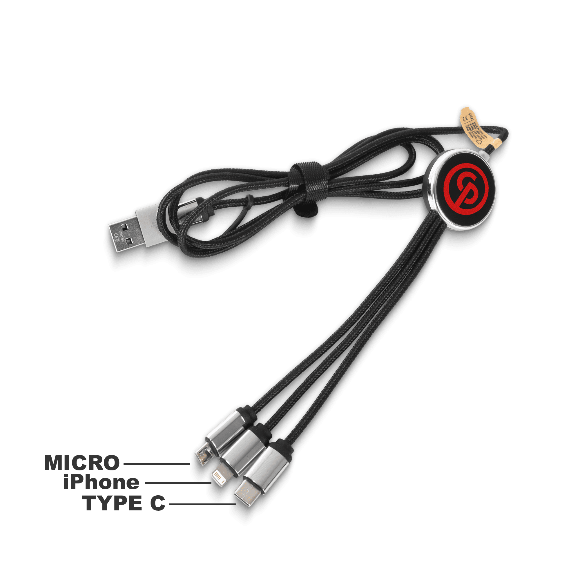 Cable with nylon braided cables with lightning, USB Type-C or Micro USB charging connector. When connected logo lights up in red! Input: 5V/2A  Output: 5V/2A