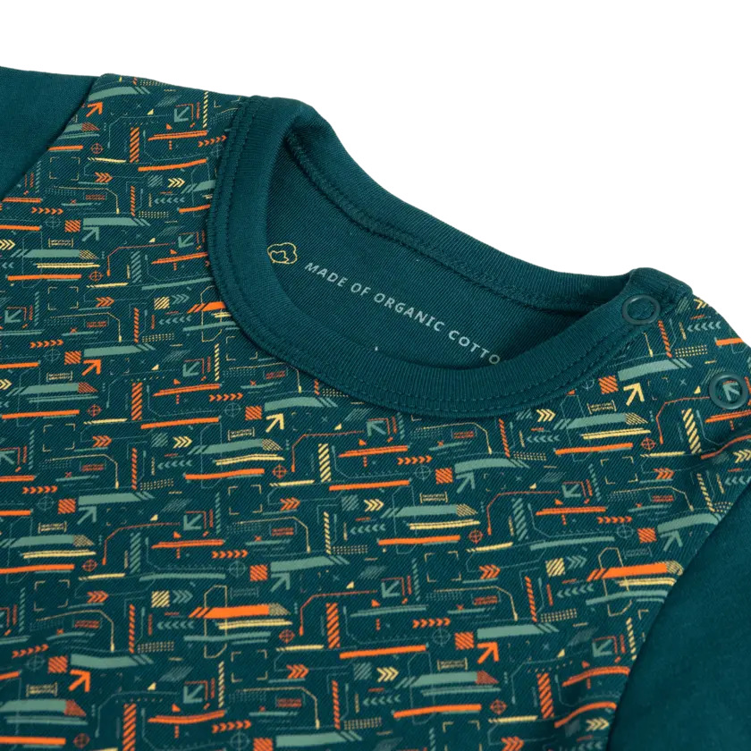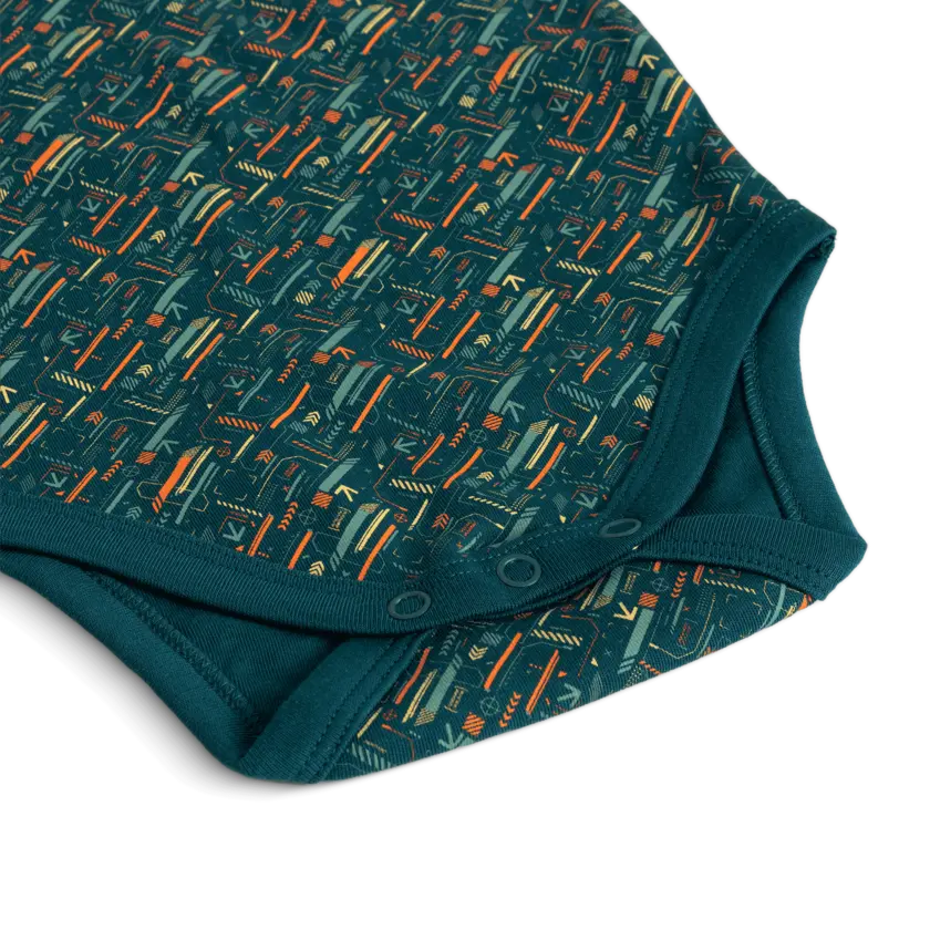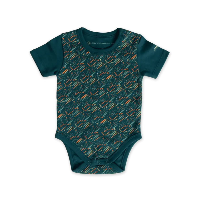 This short-sleeved baby bodysuit is made from soft, 220gsm organic cotton in a cozy interlock knit. Easy-to-use metal snap buttons at the shoulders and legs make dressing simple, while the gentle, double-layered elastane rib at the neck and leg openings ensures a snug yet comfy fit – perfect for little movers.